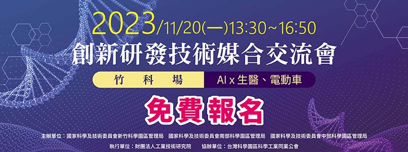 科學園區管理局為因應5G、IoT以及AI等新興產業之快速發展,加速企業內部的雙軸轉型(數位/綠色)推動,協助科學園區進駐廠商跨領域技術合作,布局未來新興市場,進而強化台灣產業競爭力,特委託工業技術研究院於竹、中、南三園區辦理「創新研發技術媒合交流會」,竹科場以「AI x 生醫、電動車」為主軸。